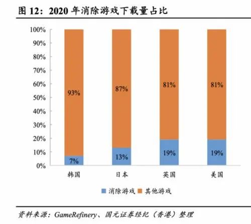 而且,“三消游戏”不仅在国内受欢迎,在欧美国家同样深受游戏玩家喜爱。据GameRefinery报告,2020年消除类游戏是美国和英国最大的细分游戏品类,均占所有游戏的19%,约占整体市场收入的27%和24%。
