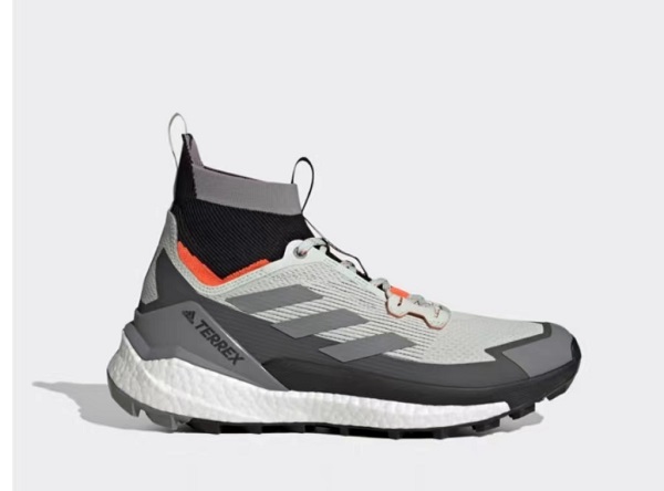 袜套版TERREX Free Hiker 2采用高帮设计,以灰色为主色调。鞋身包边、鞋头以及鞋侧处有专门为户外徒步鞋设计的热熔补强。