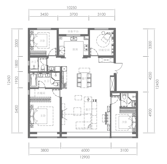 在产品定位之初,晓风印月便对客群进行了专题化的精细研究,抓住客户的痛点和敏感点,并以此为依据,设计建筑面积约102-169㎡三至四室全能空间,从物理属性、生活属性等维度进行了迭代升级。