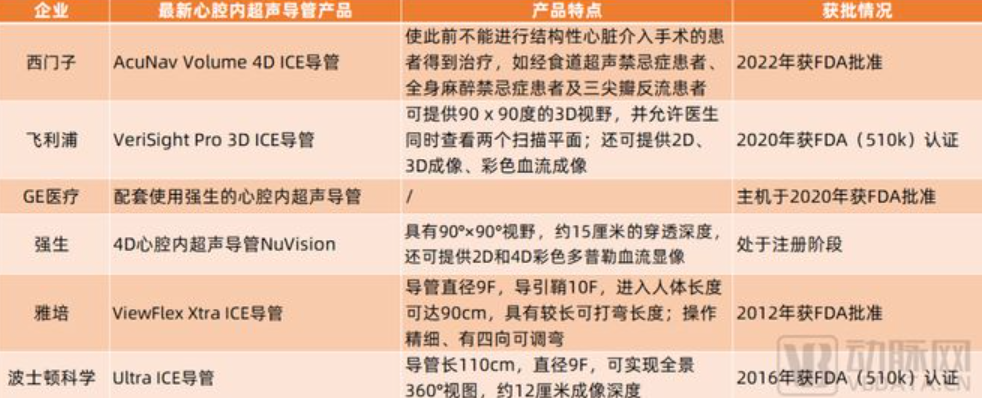 例如,西门子已于2022年最新获FDA批准的AcuNav Volume 4D ICE导管可提供2D、4D心腔内成像,2D、4D彩色多普勒血流显像以及频谱多普勒。临床专家表示,该款ICE导管开拓了应用范围,使以前不能进行结构性心脏介入手术的患者得到治疗,如经食道超声禁忌症患者、全身麻醉禁忌症患者及三尖瓣反流患者。