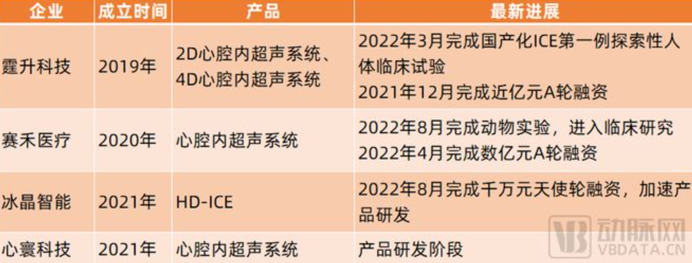 在国内,目前主要有四款已上市ICE产品,分别由西门子、波士顿科学、强生、雅培提供。不过,国内也有霆升科技、赛禾医疗、冰晶智能、心寰科技等创新企业开始积极研发心腔内超声,且已取得突破性进展。