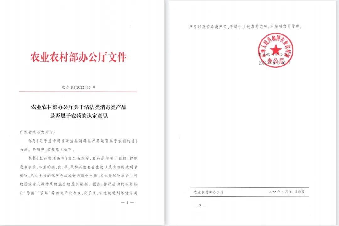 据悉,此次农业农村部办公厅发布“关于清洁类消毒类产品是否属于农药的认定意见”(下称“意见”),是为回复广东省农业农村厅提交的《关于恳请明确清洁类消毒类产品是否属于农药的函》。青眼致电广东省农业农村厅得知,因为定义原因,此前不少人有疑问,不清楚市场上那些宣称“杀螨”“除螨”的洗衣粉、洗衣液、洗手液是否属于农药,这才发布了函件请上级部门明确。