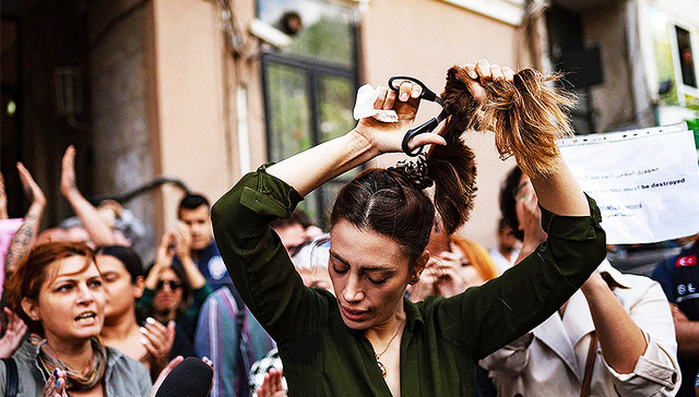 当地时间9月21日,在土耳其伊斯坦布尔,生活在土耳其的伊朗妇女Nasibe Samsaei在伊朗领事馆外举行抗议活动时剪掉了自己的马尾。此前,一名伊朗女性,22岁的阿米尼(MahsaAmini),因涉嫌违反伊朗的头巾法被道德警察逮捕,并在昏迷三天后于上周五在医院去世。近日,伊朗多个城市以及首都德黑兰的大学校园内爆发大规模抗议。