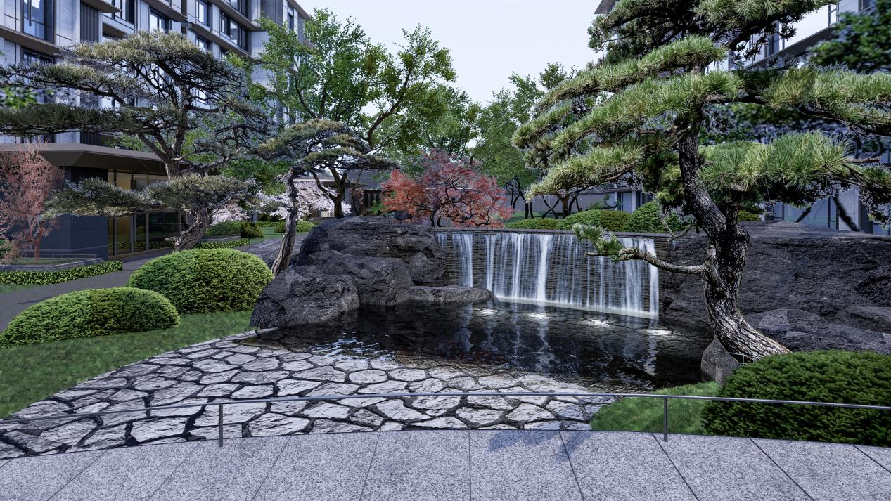 在园林景观的打造上,中建宸园以宋代文人的“西园雅集”为蓝本,借鉴宋代山水绘画“俯仰往还,远近取与”的手法,构建“一轴两园”当代山水雅集宋风景观,形成真山真水,可游可赏的独特体验。其中,一轴为万壑松风,甄选山石和松打造,婉转路径与松林相互交织,两侧嶙峋山石高低错落,营造“顿开尘外想,恍然入山林”的意境。东园为曲水流觞,承续宋式宫阙规制,采用障景、山石造园,曲折伴水而行,描绘出含蓄而自然的景观随笔。西园根据溪山行旅图,用宋式风雅情境,铺展气势相生、远近相迎的山水大象,颇有壮观豪迈之感。