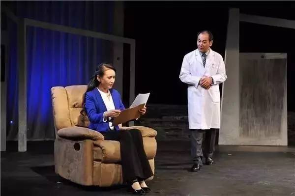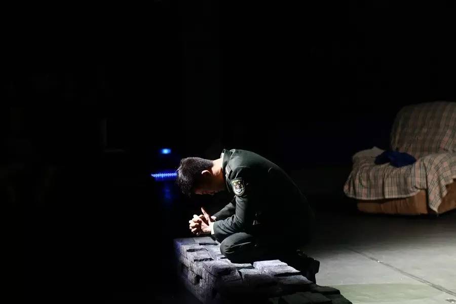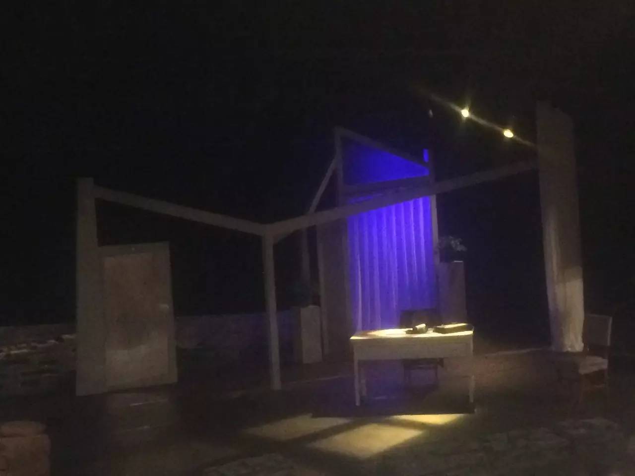 导演选择用矮小、倾斜的骨架表示心理诊所和家,又用断壁残垣来分割舞台与观众席的界限,再配之舞台后方的蓝光,我们仿佛看到了饱受精神折磨的他们心头挥之不去的忧伤。