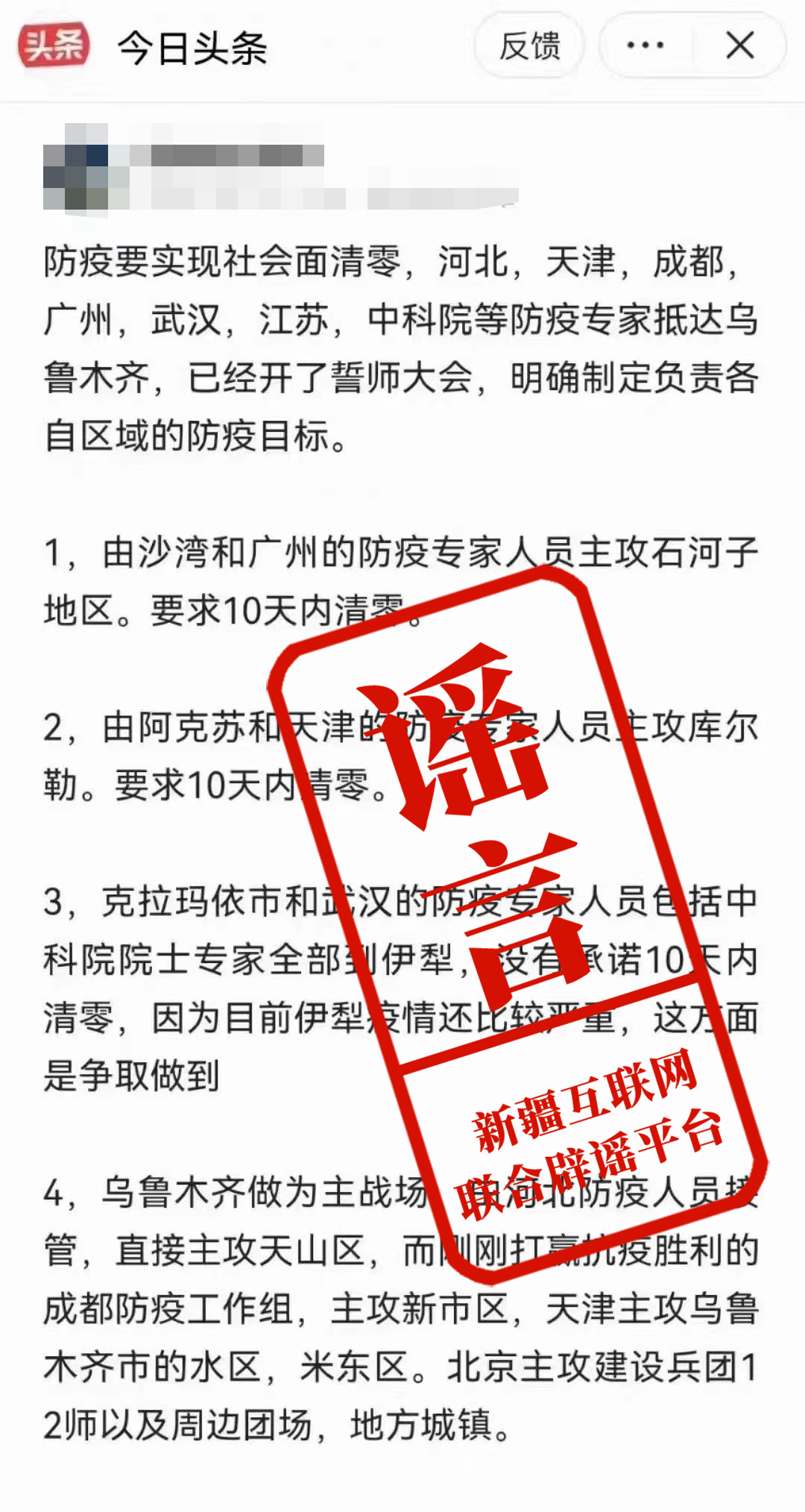 “新疆网络举报”微信公众号9月25日消息,接网民举报,近日有网民在微信群组、微博、今日头条等平台以短视频、图片、文字等形式散布“从今天开始,新疆本地核酸检测机构不参与检测,全部由内地的检测机构检测......”“河北、天津、成都、武汉、江苏、中科院等防疫专家抵达乌鲁木齐,已经开了誓师大会,明确制定负责各自区域的防疫目标......”等虚假信息及类似变种样本,经与有关部门核实查证,上述信息均为网络谣言。