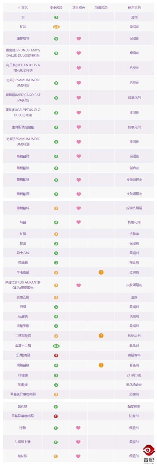 藻提取物、矿油、蓝桉叶油等柔润剂和保湿剂。