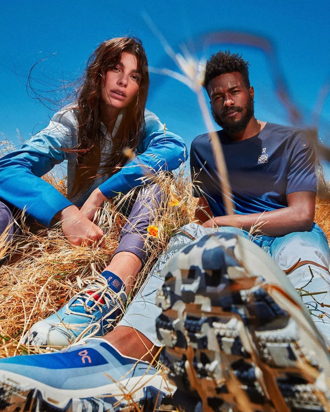 鞋履设计上,Loewe 沿袭了 On 标志性的 Cloudventure 越野跑鞋和 Cloudrock 徒步登山靴的原型,辅以手工制作的渐变色帆布鞋面以及手工压制的大理石花纹鞋底、黄铜鞋眼以及半透明防护压胶,这意味着该系列中的每一双鞋都是独一无二的;而在服装制作中,Loewe 用纯手工染色工艺重新诠释 On 的跑步T恤、防水套头夹克、跑步长裤产品,确保色彩渐变效果精细流畅。双方共花费了两年时间对这一系列进行设计和开发。