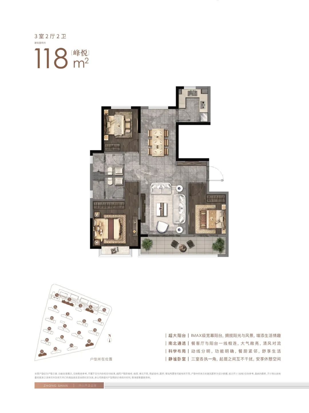 该项目打造的是建面约118㎡-170㎡全龄户型,兼顾了平层与别墅的双重优势。建面约118㎡三房两厅两卫:三开间朝南,IMAX超大宽景阳台,餐客厅一体,不论是空间视野感还是采光通风,都一一兼备。