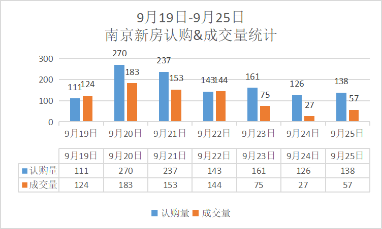 据南京网上房地产显示,上周(9月19日-9月25日),南京新房累计认购1186套,累计成交763套,相较于上上周(9月12日-9月18日)南京新房累计认购894套,累计成交610,认购量上涨约32.6%,成交量上涨约25%。