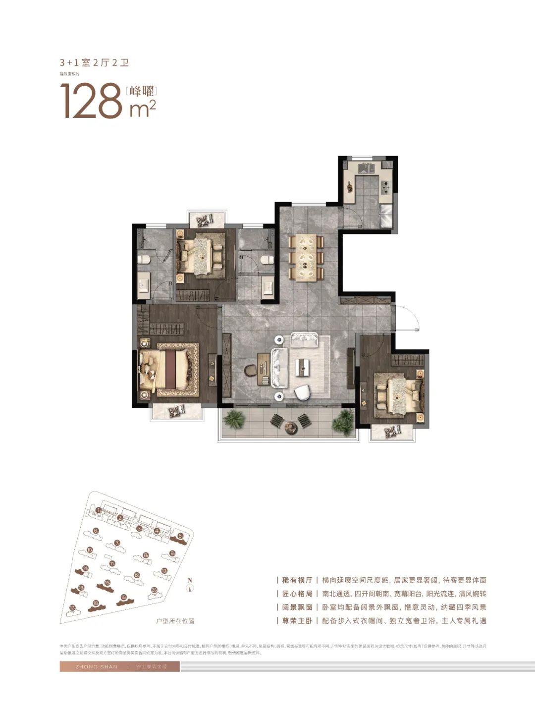 建面约128㎡3+1室2厅2卫:3+1奢阔横厅设计,可随心所欲划分功能区,实现多元化的生活方式,卧室增配270°宽幕阳台。
