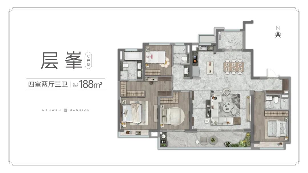 188㎡四房三卫:该户型仅有7号楼一栋,两梯两户。