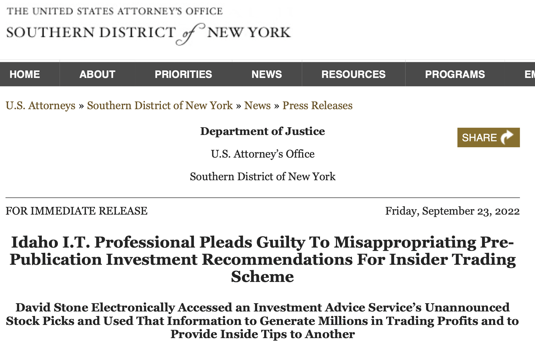 今年37岁的大卫·斯通(David Stone)是一名网络开发技术人员职业IT从业者,近日,他在美国纽约南区地区法院上承认了自己非法获取内幕交易信息的事实。