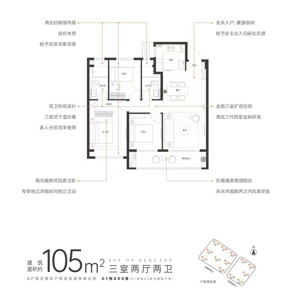 105㎡户型:三开间朝南,入户玄关,U型厨房,餐客厅一体化,约3.7米开间客厅,外连6.7米宽屏大阳台;主卧为套房设计,带飘窗,预留衣柜空间;