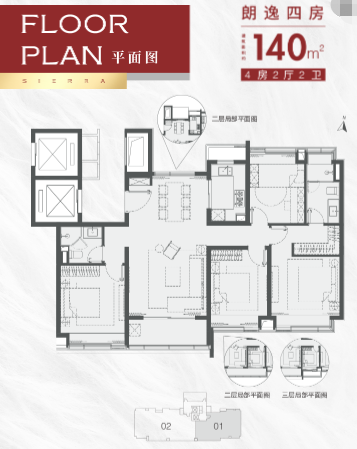 140㎡朗逸四房:4房2厅2卫设计,南北通透,南向双阳台设计,通透性更强,通风、采光、视野都得到了保障。