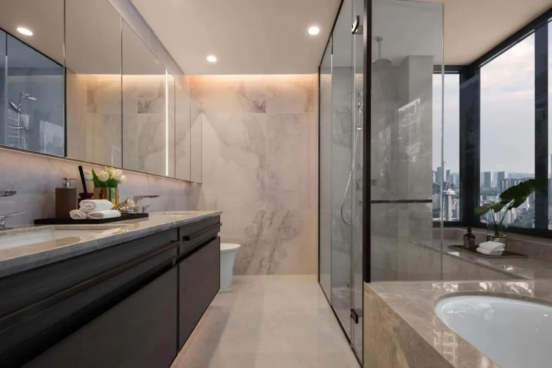 该户型总共三套间设计,主卫有步入式衣帽间和超大独立卫生间,配浴缸与双台盆,最大限度的保证了居者的舒适性和私密性。