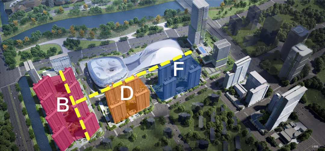 B、D、F住宅地块呈现“L”字形围绕文化中心紧密布局,超广角楼间距,最大化保证了楼间距。其中以约20万方复合文化中心为引擎,打造科技馆、图书馆、演艺中心、市民中心及规划馆四大场馆。