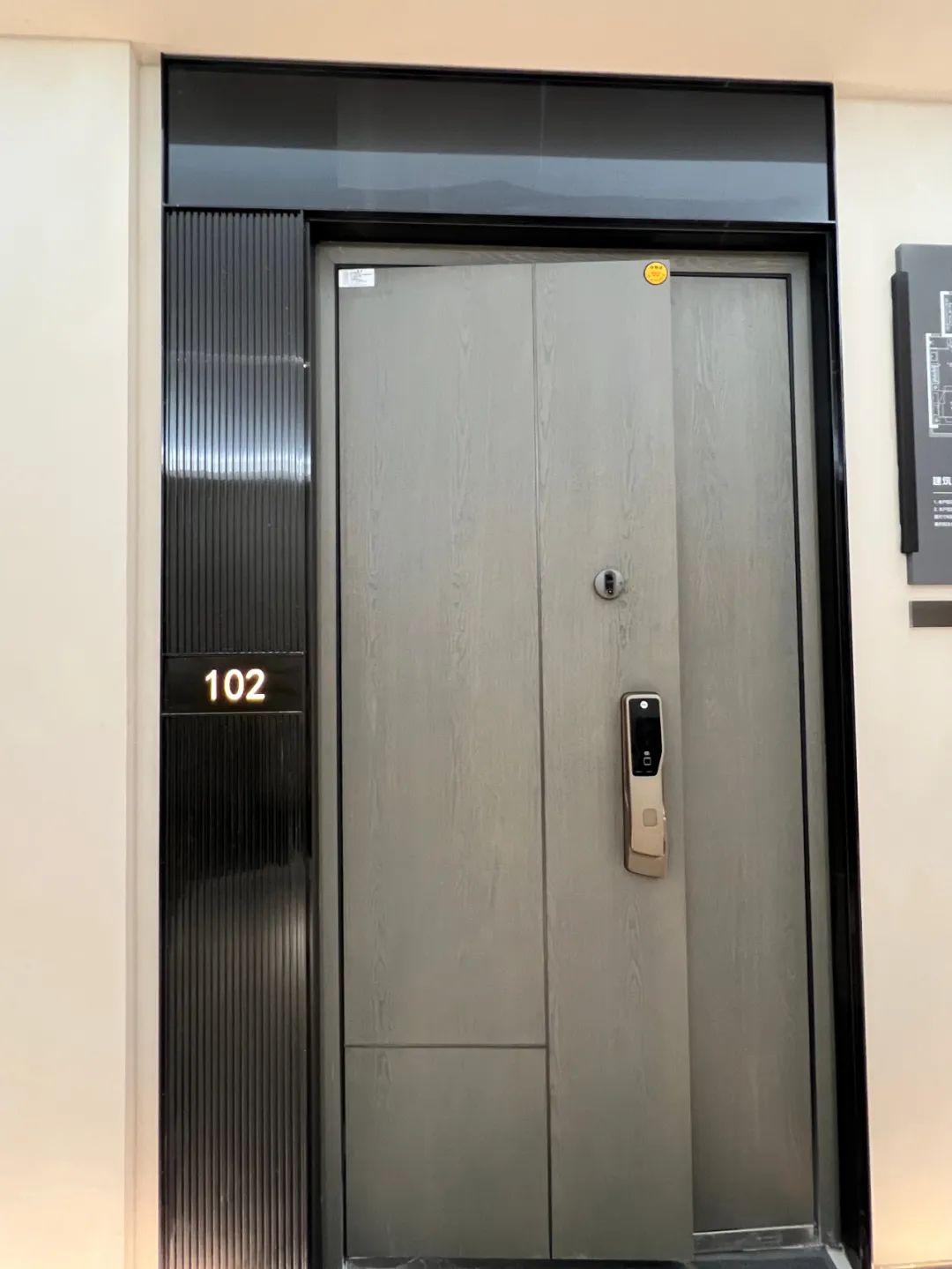 项目采用了酒店式入户门头,入户门为钢木复合子母门,配备电子猫眼,均为交付。