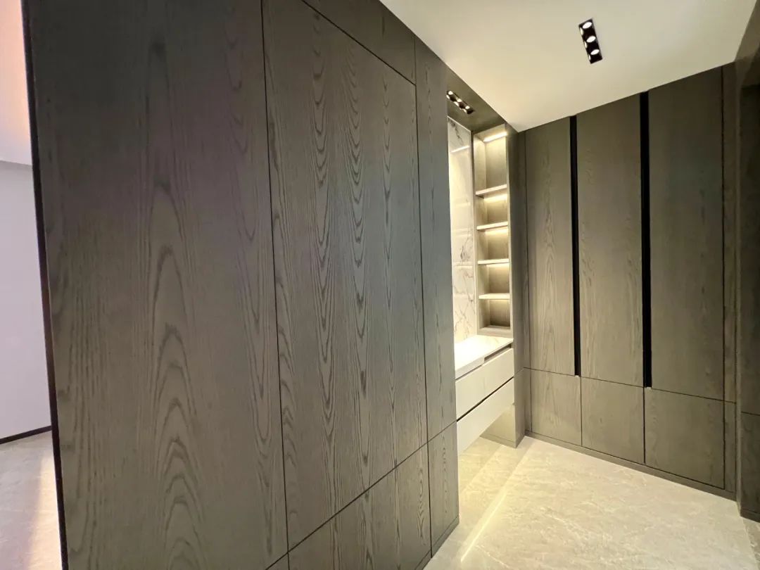 进门玄关和次卧,玄关拐角处做了储物柜,储物柜里同样带有鞋柜精灵,次卧做了木饰面隐形门,和其它几卧距离较远,私密性较好。