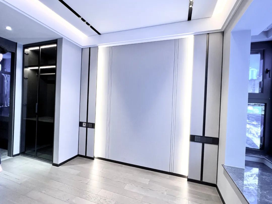 另外主卧的背景墙,顶部筒灯和背景墙的灯带均在交付范围内,主卧还带有小型衣帽间和独立卫生间。