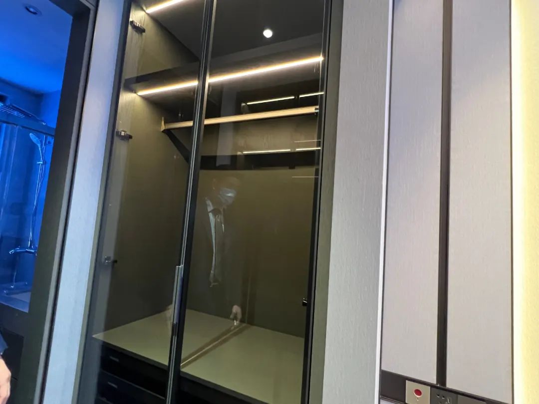 项目巧妙利用空间,设置衣帽间,在衣帽柜里还贴心设计了首饰区、领夹领带区和专门放裤子的夹层,细节十分到位,柜内的灯带也在交付范围内。