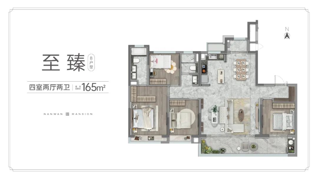 165㎡四房两卫:近6米开间,南北双阳台设计,客厅的尺度感更大;中西式双厨房,可以随时随地根据心情切换美食;主卧带有步入式衣帽间,主卫双台盆,南向次卧连接阳台,