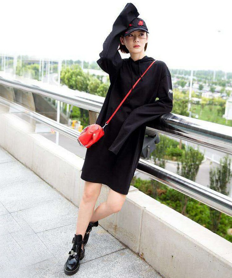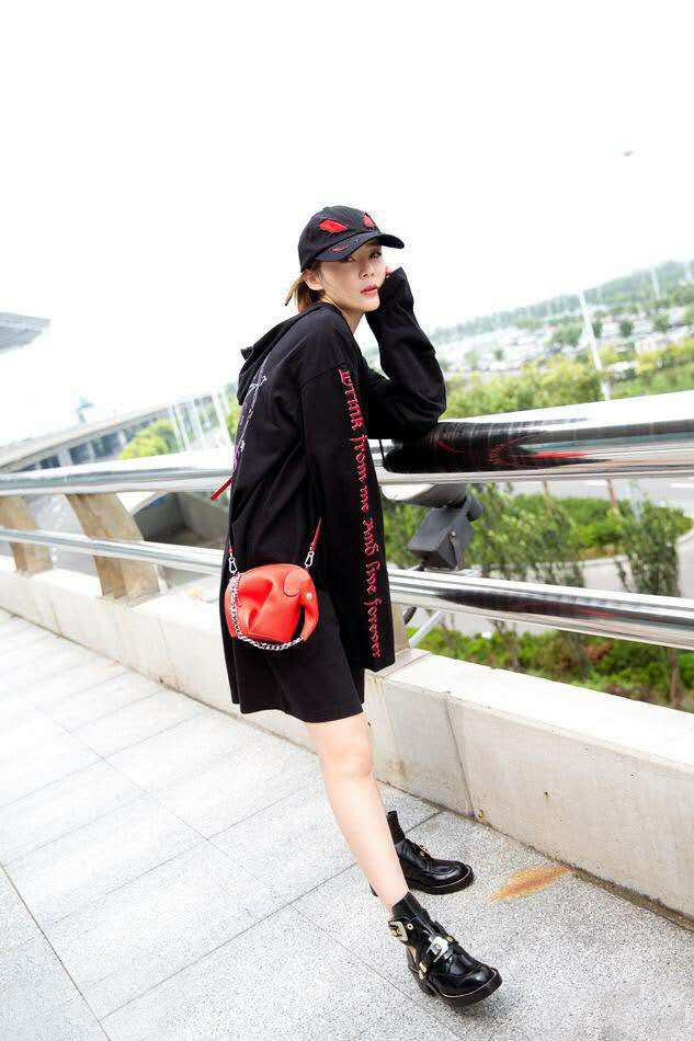 袁珊珊最近的街拍也穿了大袖子Vetements,红黑配。