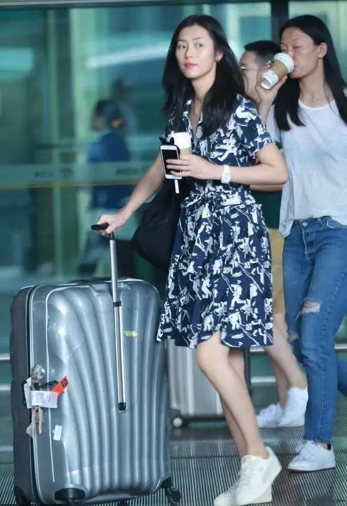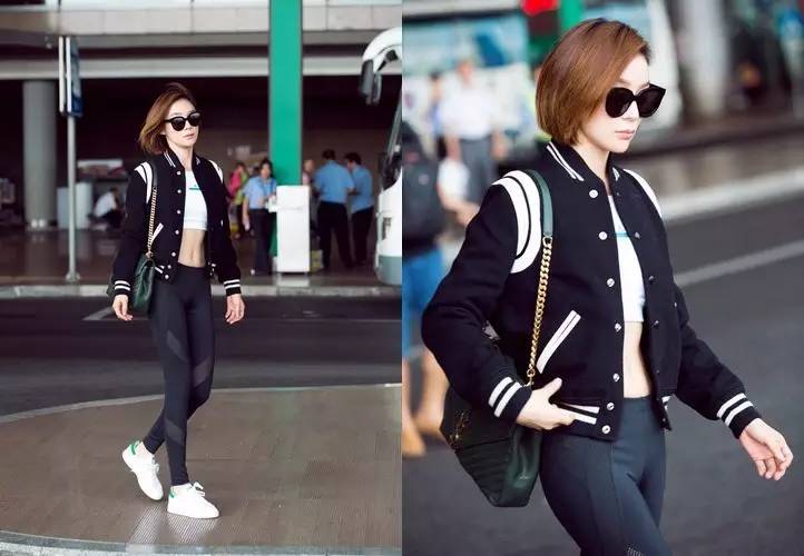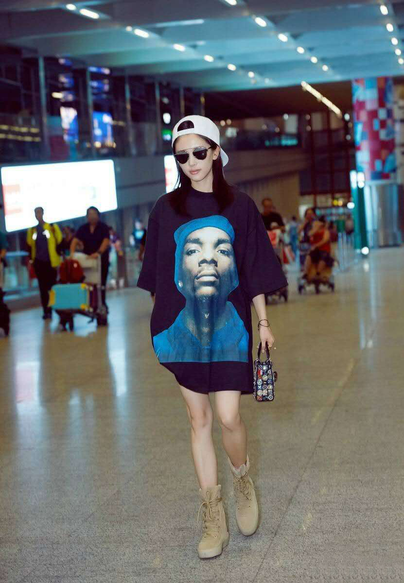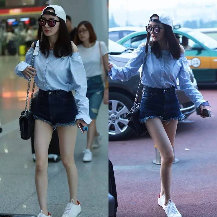 蓝色衬衫可以多买几件。杨幂最近机场照,大袖子衬衫配红尾。
