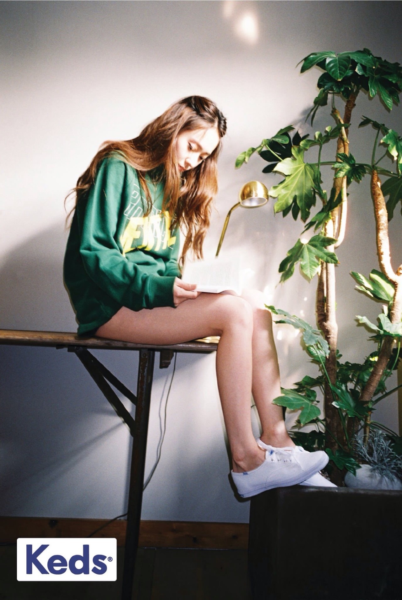 水晶最近帮Keds拍的新画报也在穿绿色大卫衣,直接搭了小白鞋,没穿裤子。