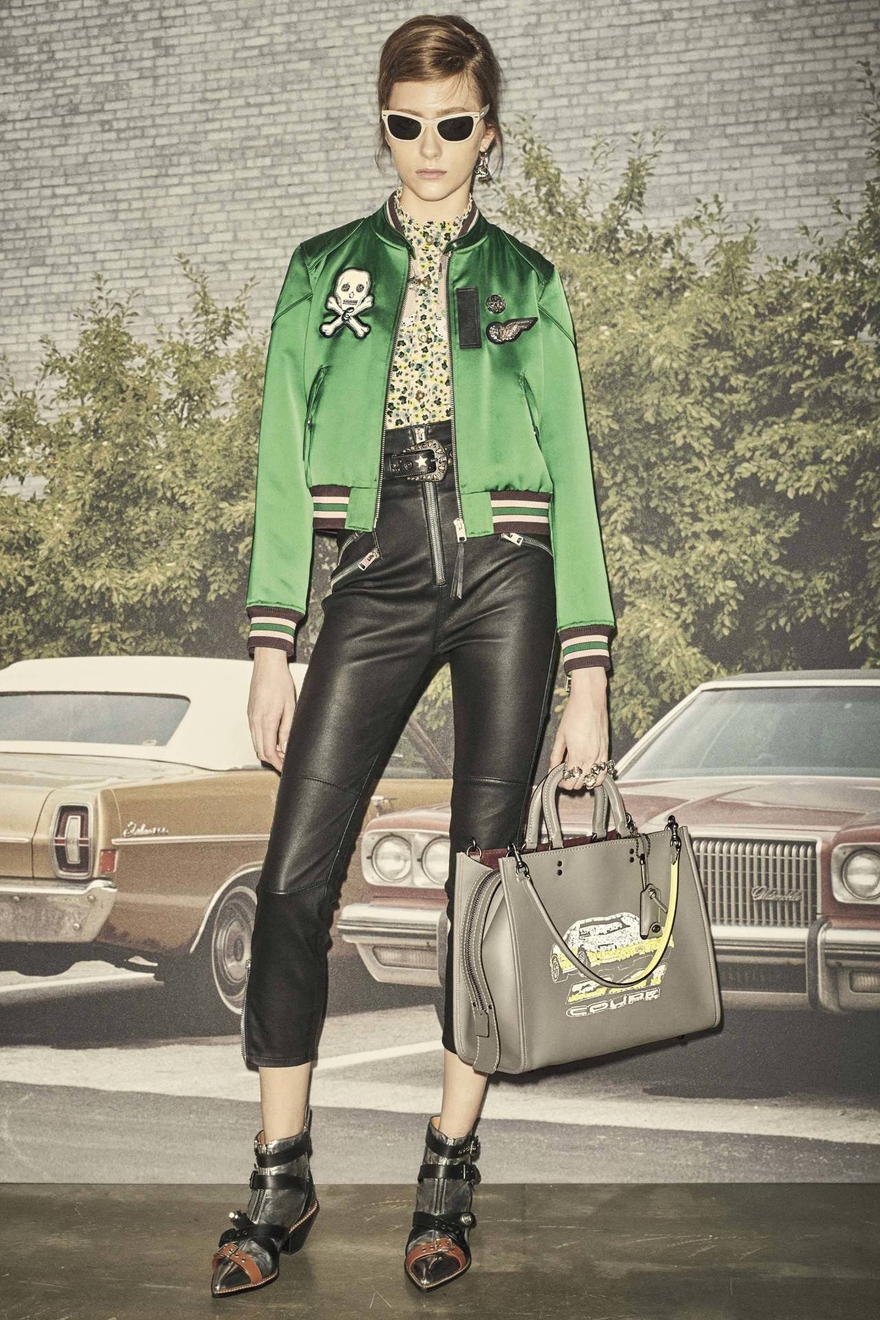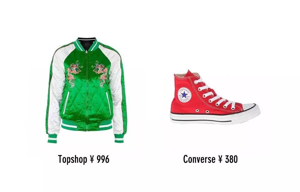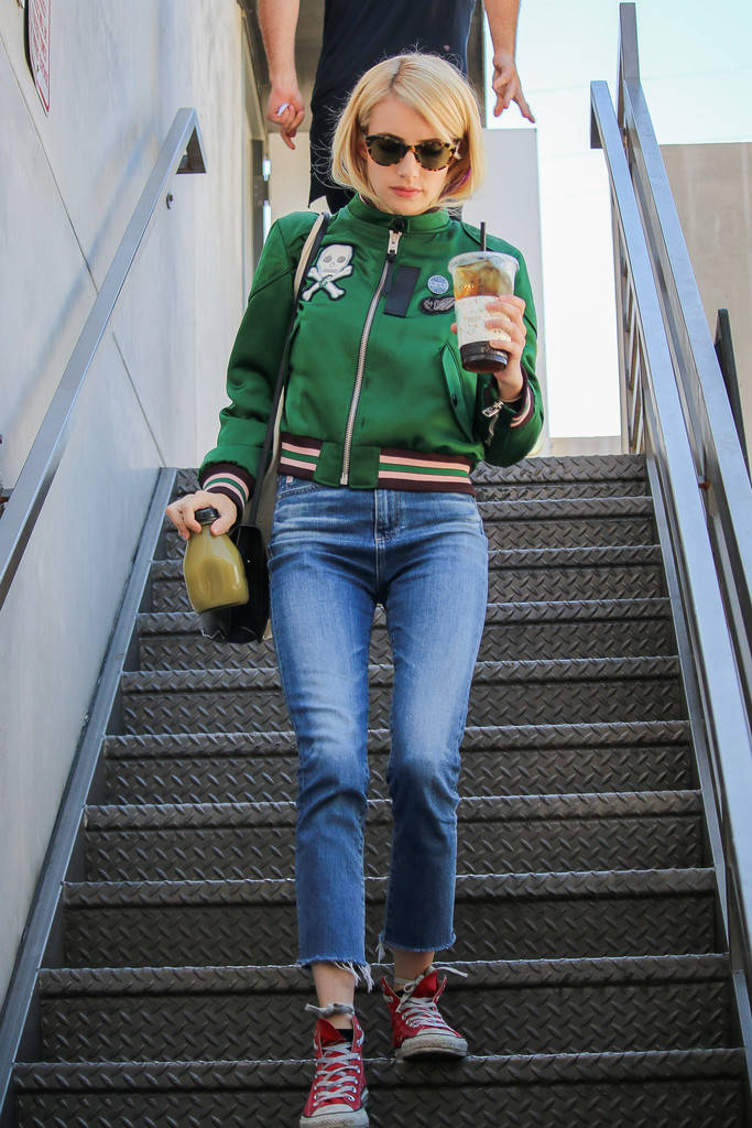 夹克出自Coach,这件上衣是缎面的,比较有质感。Emma还大胆用红色匡威红绿配,竟然也很和谐。