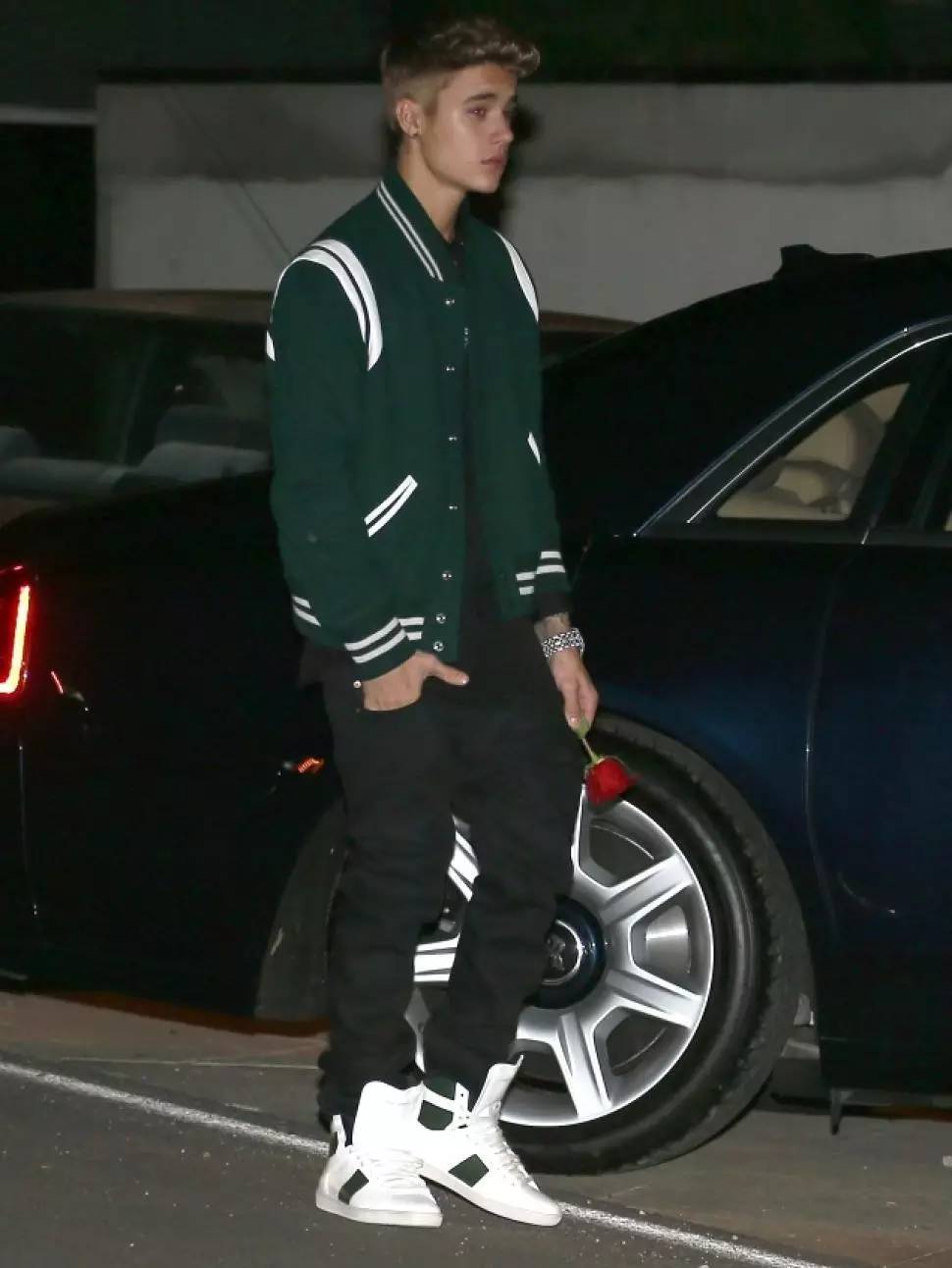 啊我没看错颜色吧?JB也在穿,拿着玫瑰花在等谁呢。