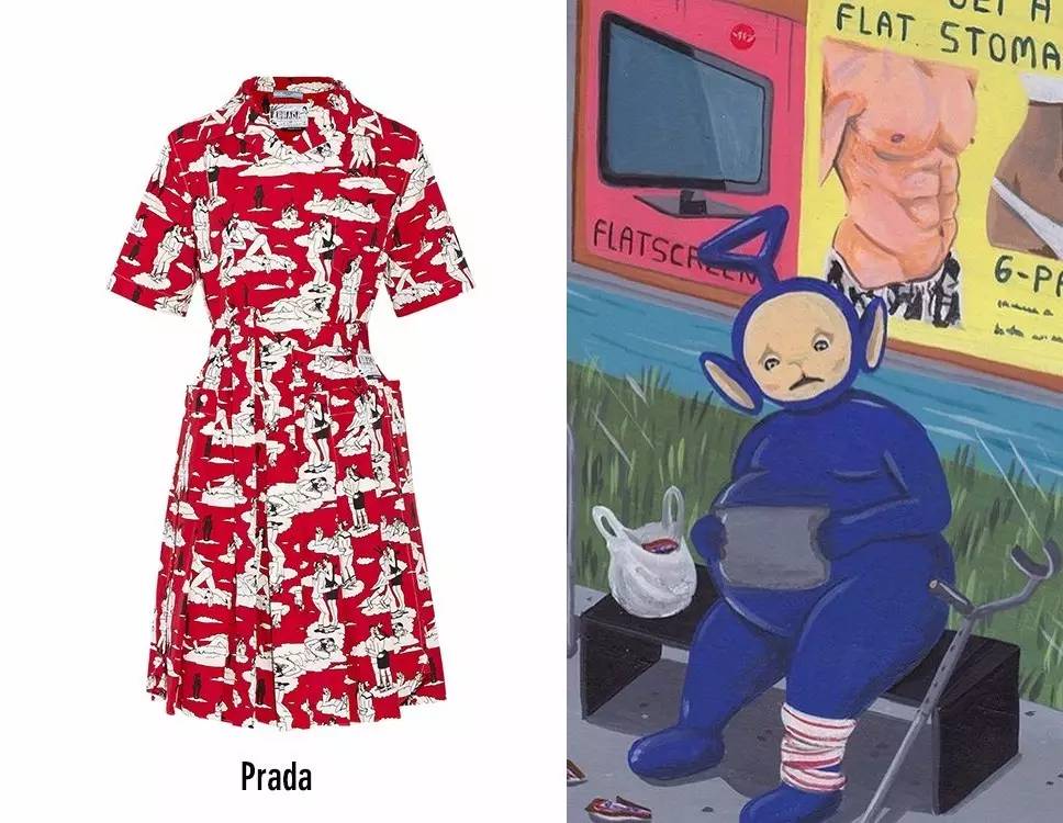 这件衬衫裙是Prada2016秋冬印花府绸衬衫裙,是与比利时插画师BrechtVandenbroucke 合作的。上半身很普通,但是下摆比较大,而且同样有同色的腰带来提高腰际线~