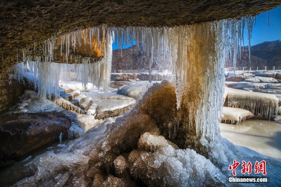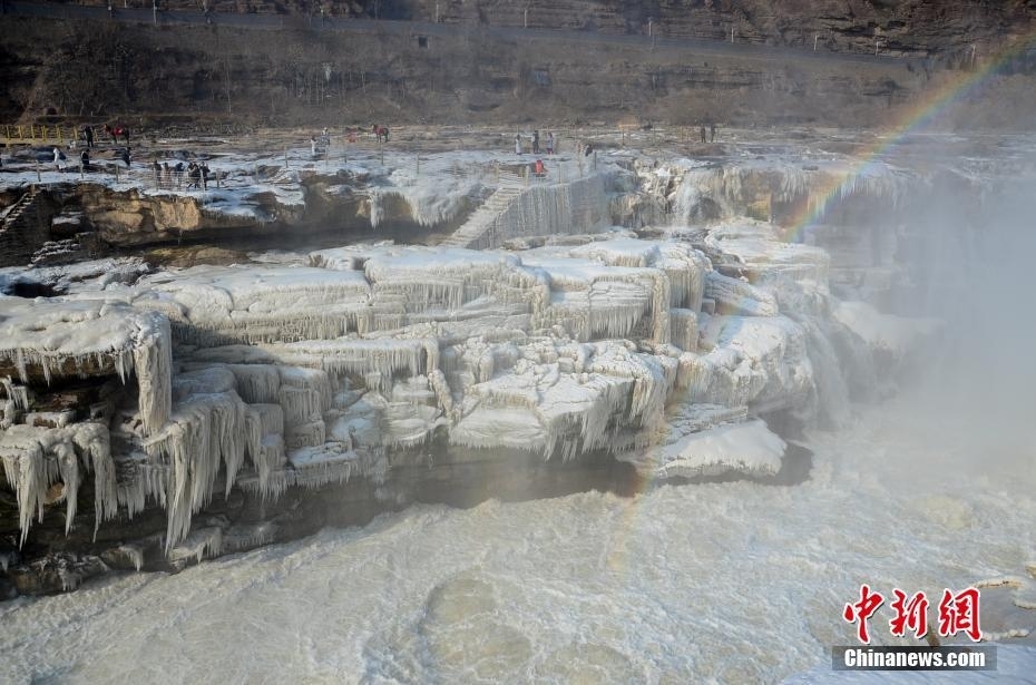 受强降温天气影响,黄河壶口瀑布形成冰挂景观,晶莹剔透的冰挂与瀑布上空彩虹交相辉映,景色迷人,吸引了众多游客。张建良 摄