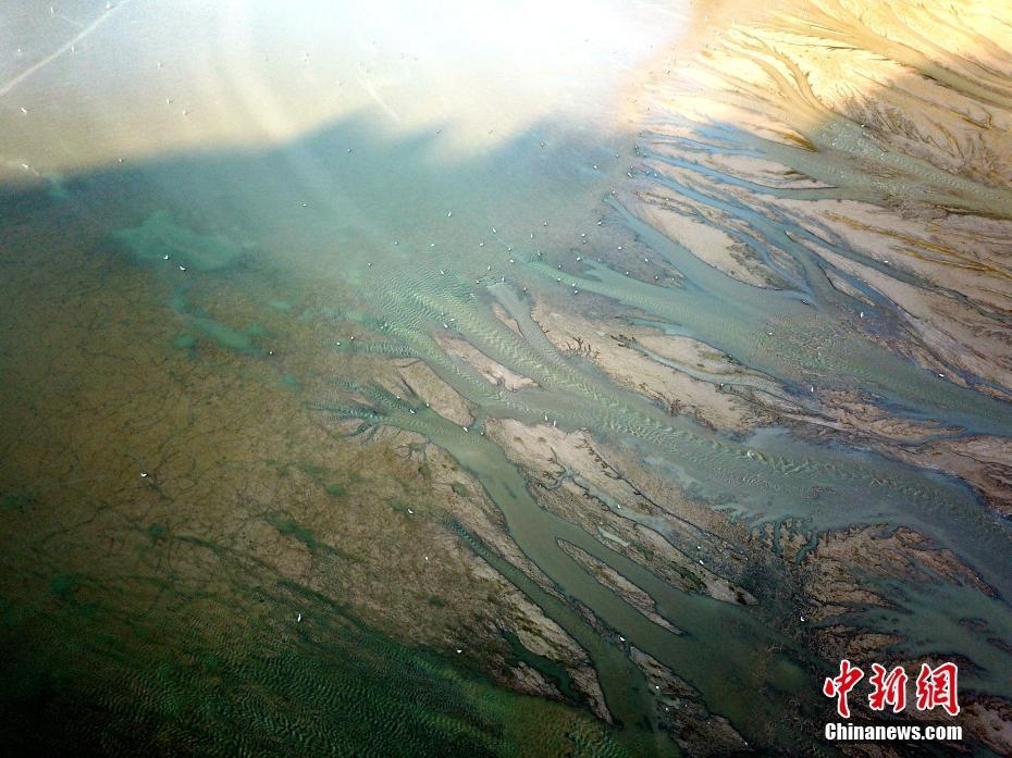 河南济源小浪底水库黄河三峡段,河底底部纹路明暗相间,酷似树影交错,成群的水鸟在“枝头”翔集,美似一副天然油画。 王中举 摄
