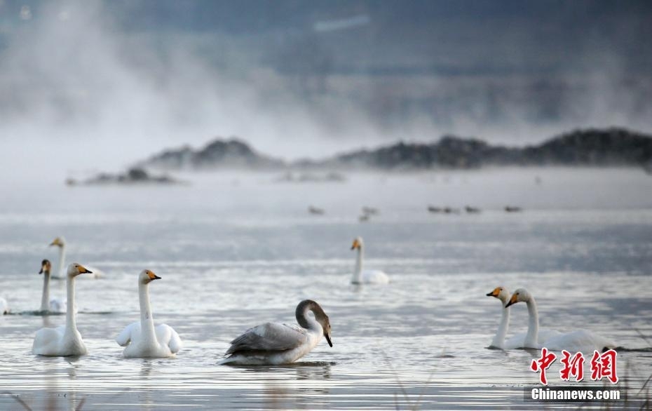 一群大天鹅飞临青海省海东市化隆县群科镇黄河岸畔,或悠闲嬉戏,或四处张望,并与远岸树木及河面薄雾构成一幅山水画卷。李玉峰 摄