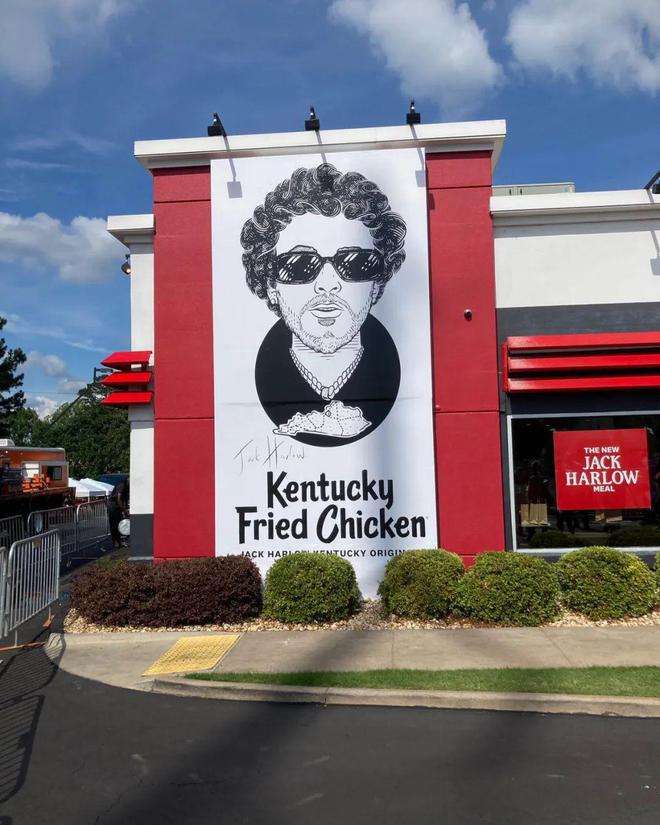 肯德基与Jack Harlow 的合作也与之类似,在套餐中的红白色可乐杯与全家桶,甚至门店外招牌板上印上了Jack Harlow的卡通形象。将经典的肯德基老爷爷换成流量明星,给品牌增添了创新趣味。