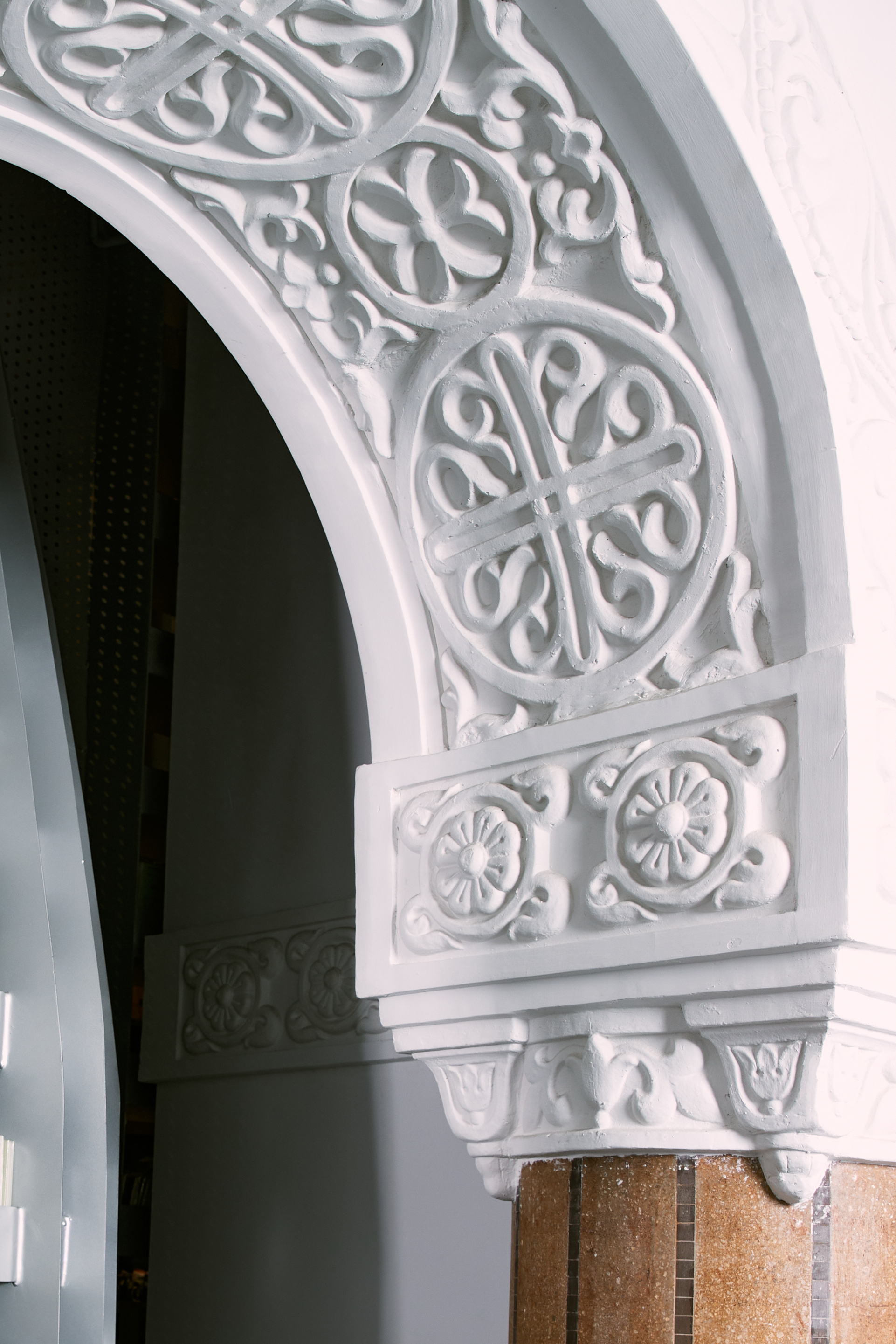又比如,店铺内端木制墙面嵌以熊猫白大理石进行装饰。在保留西方装饰艺术的对称性、几何形状等特点的同时,融入高档木材等中国独有的装饰材料,或是传统的中国图案,正是上海独特的艺术装饰风格的精髓。