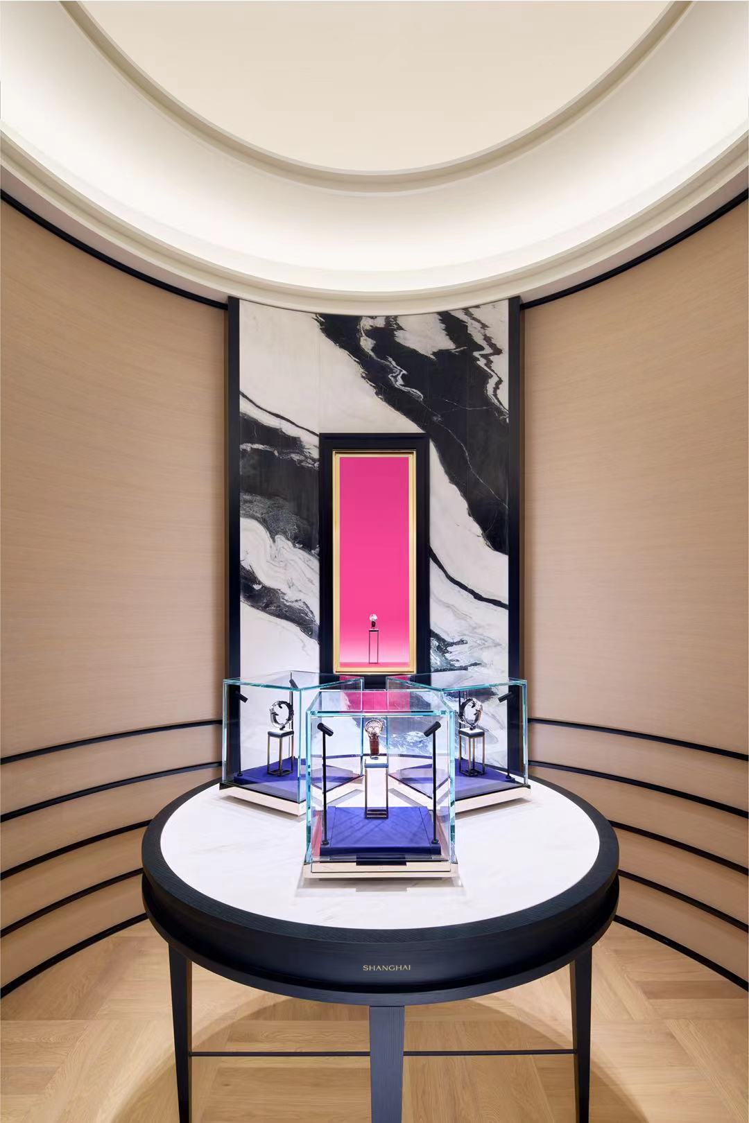 在这个命题下,上海表在新开的南京西路全球首间旗舰店中给出了部分答案。这间门店有着强烈的上海特色的艺术装饰风格(Art Deco),比如门店顶部采用上海老建筑常用的穹顶设计,去其繁复的装饰性线条,以更简约、更现代的方式呈现,而橱窗内饰设计则汲取外滩建筑群和石库门的建筑美感。