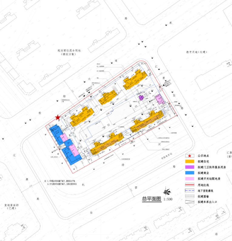 拟建方案总建筑面积约为6.41万平方米,其中:地上计容建筑面积约4.62 万平方米,主要功能为住宅及相关配套服务用房:地下建筑面积约 1.79 万平方米,主要功能为车库及相关配套辅助用房。