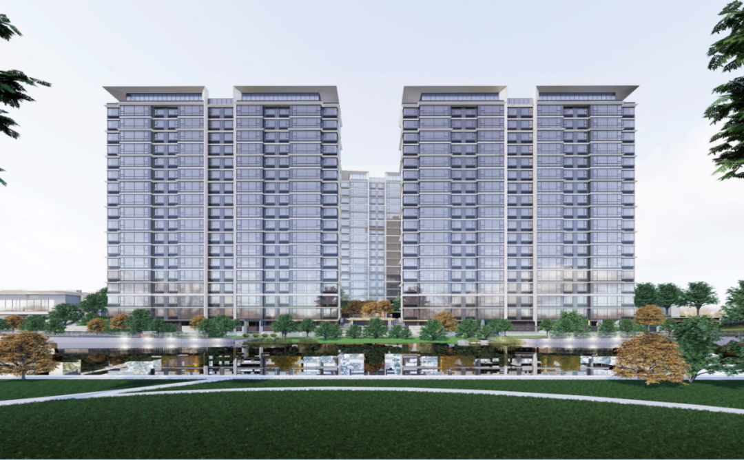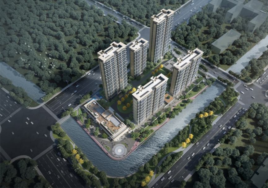 从外立面效果图可以看出,项目采用了大面积玻璃幕墙,项目左侧还设置了社区商业体,并搭配了河道水景。另外,项目的南侧面还有大面积绿色草地。