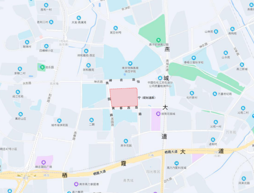 该地块位于栖霞区燕子矶新城,西临燕园路,南临寅春西路,东临怡宁路北侧为规划特殊教育用地,地块东北角有规划110KV变电站用地。地块西北角及北侧现有高压塔一座和现状现状高压杆线,规划迁移或下地。