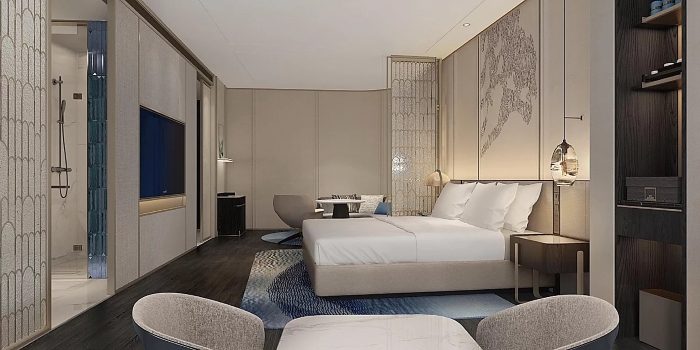 酒店的312间客房及套房秉承“水为生命起源”的概念,以黛黑、栀子白为主色调,青木灰和苍蓝为辅,点缀有泼墨、水纹。客房均配备全球知名水疗品牌“Essential Elements怡馨源”的沐浴护理产品、多款精选茶饮以及华邑定制中式茶具。湖景客房及以上房型更配有戴森“中国红”吹风机、德龙小家电及卫洗丽等豪华卫浴设施。