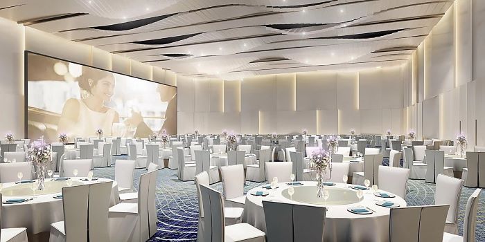酒店内设有2个无柱式宴会厅和6个灵活的多功能厅及会议室,均配备高品质影音视听设备和全幅落地窗,自然采光充沛,可一览长风公园的美景和城市风情。其中大宴会厅面积为540平方米,可根据需求组合或分隔。