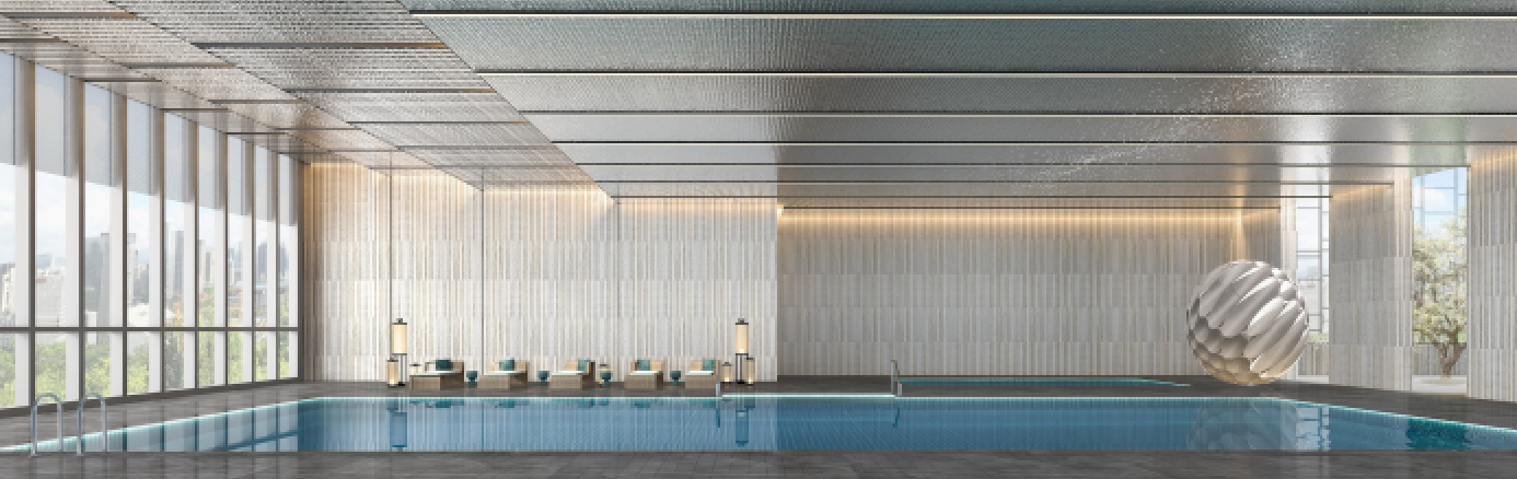 酒店777平方米空间的健身中心以“涧”为构思,旨在以自然力量让身心回归平和。室内恒温游泳池和儿童泡池区域双向采光、观景,瑜伽房则为玻璃房式设计,酒店另配有干蒸设施。