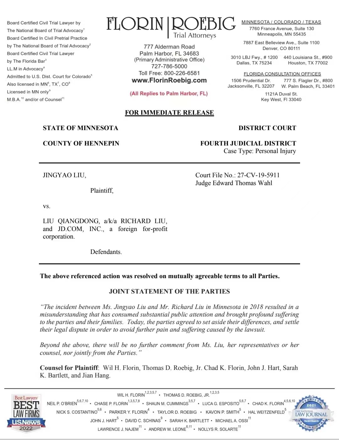 声明称:刘强东先生和刘婧尧女士于2018年在美国明尼苏达的一次偶然事件所造成的误会,占用了大量的社会资源,也给彼此的家庭造成了深重的困扰。今天,为了避免进一步的诉讼伤害,双方决定消除误会,达成和解,为这次事件画上句号。除以上声明,刘婧尧女士及其代表和律师不再发表任何评论,双方也不会出具其它的联合声明。