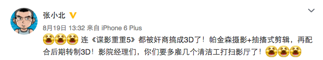 针对特效不多的国产片也开始采用3D版的疑问,曾在今年暑期档初期的《寒战2》上映时集中爆发。当时,出品方安乐影业回应称:之所以《寒战2》在国内只有3D版本上映,主要是为了“防盗版”。事实上,也有一些发行公司的工作人员表示很多影片做3D是为了防盗版。不过在这一议题上,张小北的观点与之相反,在他看来,即便是为了反盗版,也不应该牺牲观众的观影体验。