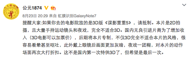 此外,包括桃桃淘电影、木卫二三事、毒舌电影等多位影评人的电影公号都对《谍影重重5》采用3D放映表达了不满。与此同时,文章下方也出现了不少对3D体验不佳的评论。门户网站编辑吴沁在观看时也有同感,“开场的时候感到有些晃,不过习惯了就好。”当然也有人认为晕眩的感受或与3D无关,影评人cbvivi表示这可能因人而异。