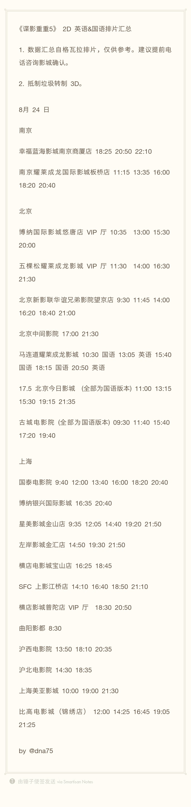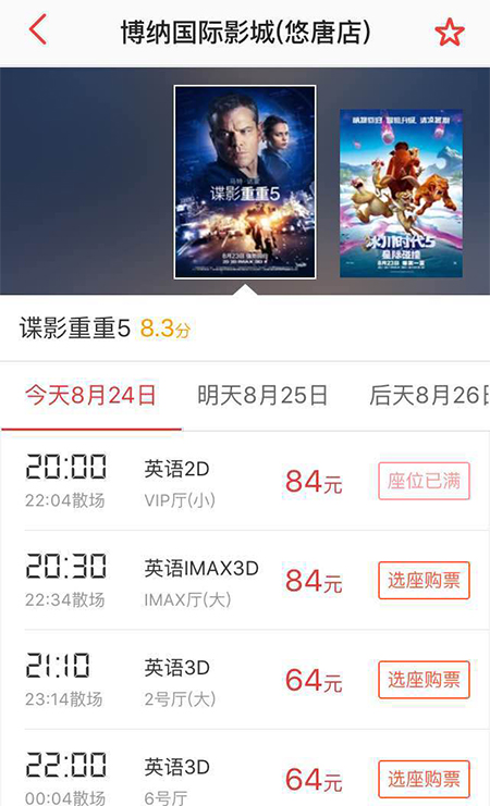 附南京、北京、上海等城市《谍影重重5》2D版放映信息: