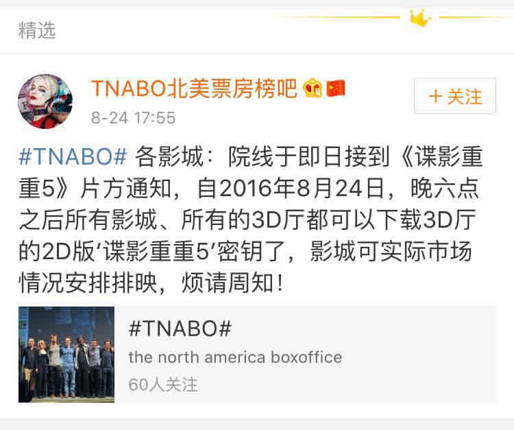 早前有消息称《谍影重重5》将重新安排放映版本,但截至发稿相关方还没有发布正式声明。不过已经有包括“TNABO北美票房榜吧”在内的微博号在傍晚称:“自2016年8月24日,晚六点之后所有影城、所有的3D厅都可以下载3D厅的2D版‘谍影重重5’密钥了,影城可实际市场情况安排排映”。