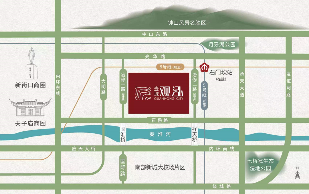 地铁5号线(在建中)与8号线(规划中)换乘站“石门坎站”,地铁6号线(在建中)“中和桥站”,未来2站大校场,3站夫子庙,6站新街口,三线轨交,畅达全城。